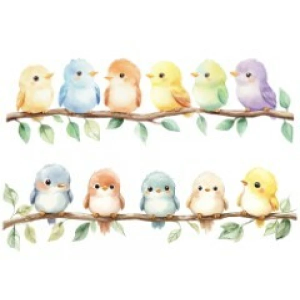 TRANSFER TEXTIL PASSE E CRIE - BARRADO DE PASSARINHOS AZUL E AMARELO 0,21cm X 0,29cm| Modelo PC0017